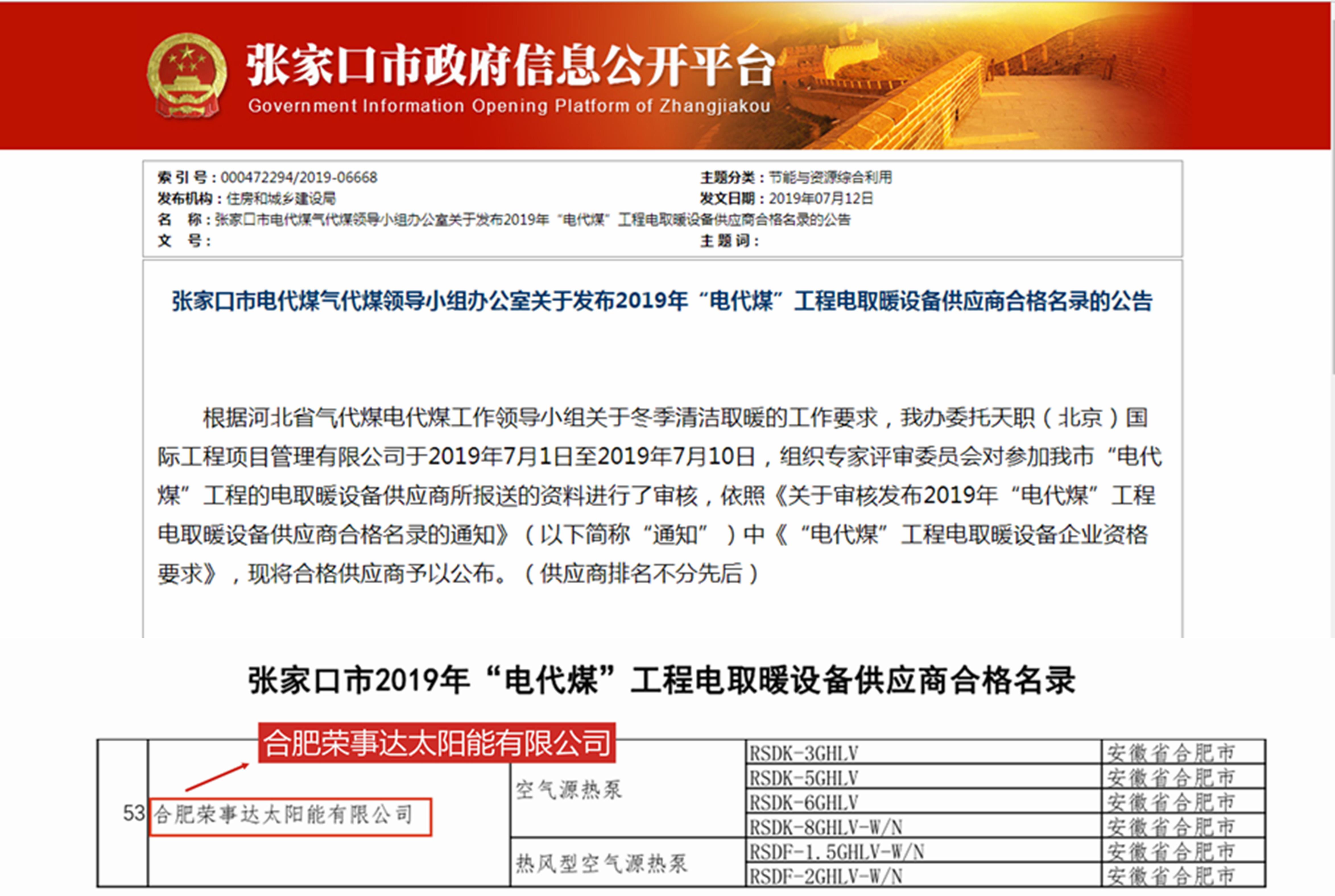 在河北张家口市最新的政府公告中,荣事达空气能成功入围张家口市2019年“电代煤”工程取暖设备供应商名录。