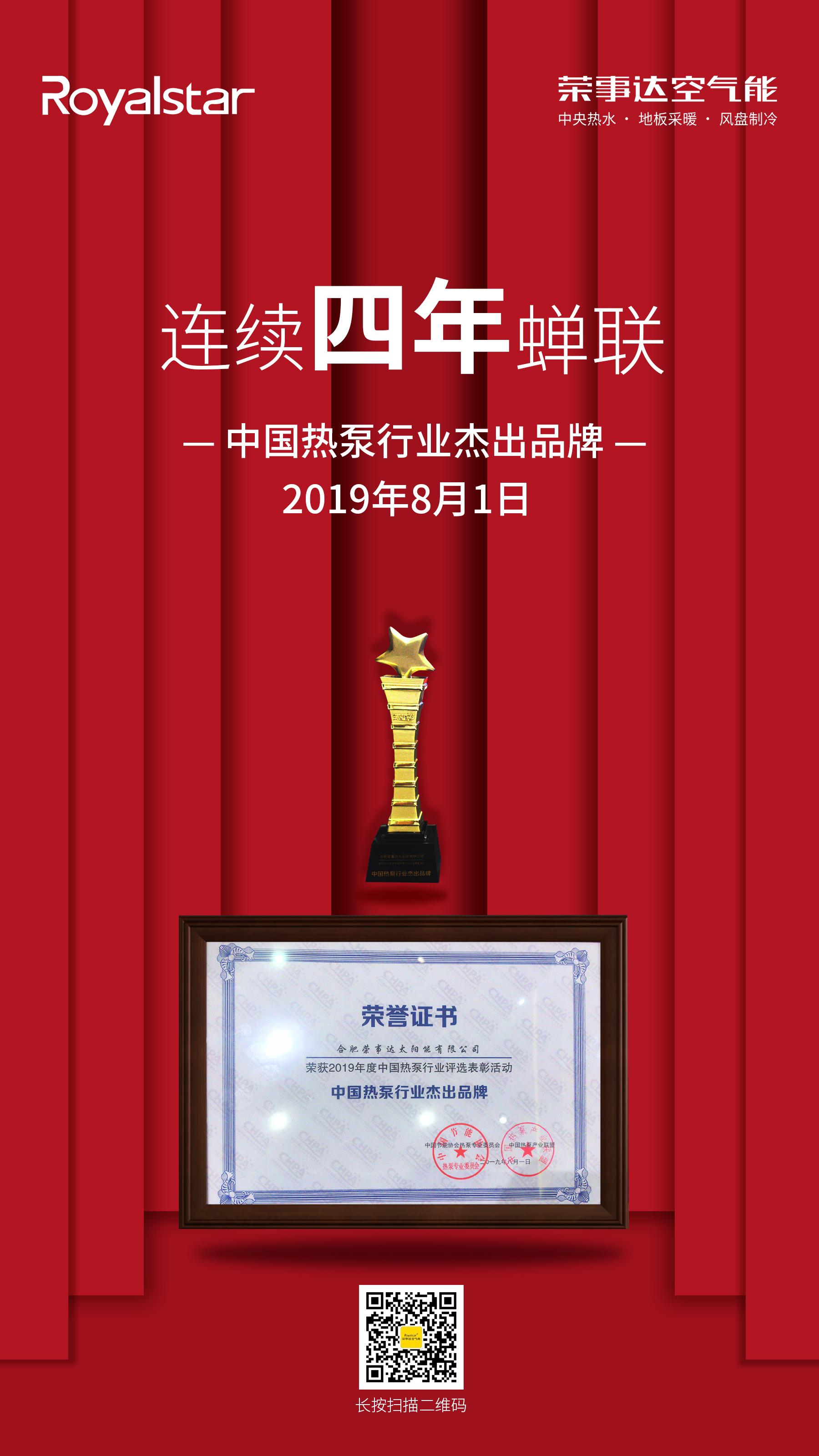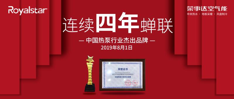 8月1日-2日,2019年中国热泵行业年会暨联盟成立十周年纪念会在上海举行。此次会议是亚洲热泵产业界最具规模的行业盛会,汇聚国内外热泵行业最具影响力的品牌。荣事达空气能受邀出席,以实力蝉联“2019年度中国热泵行业杰出品牌”殊荣,这已是荣事达空气能连续四年蝉联此项荣誉。