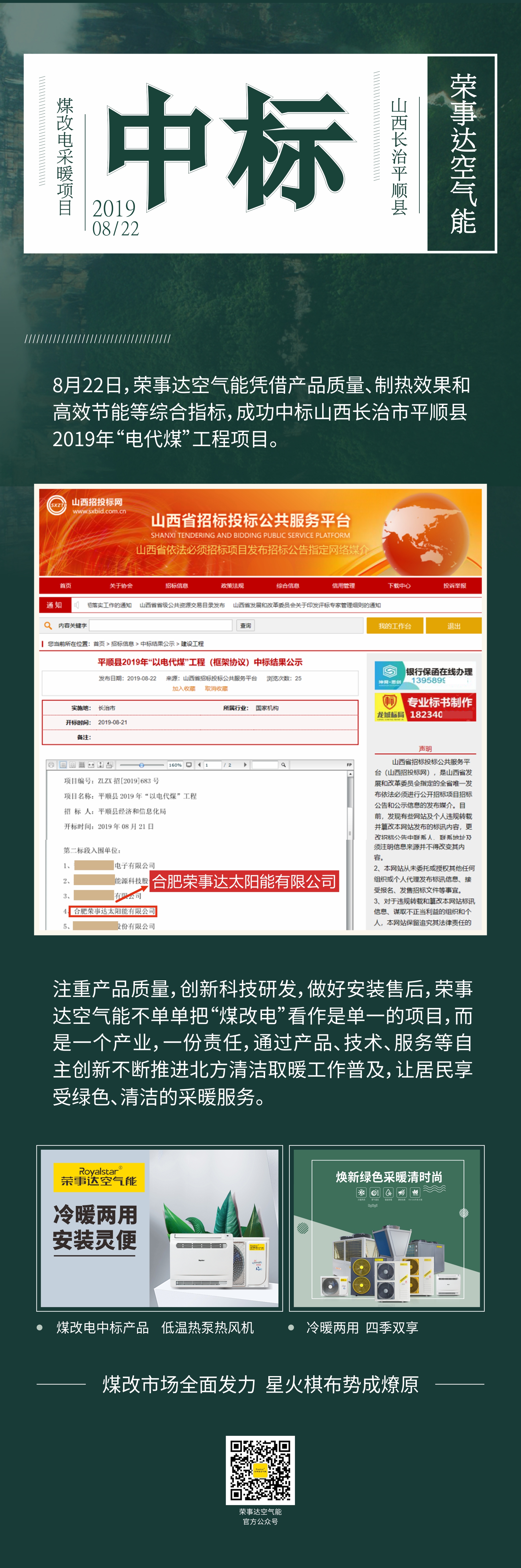 荣事达空气能中标山西长治平顺县2019年“电代煤”工程项目