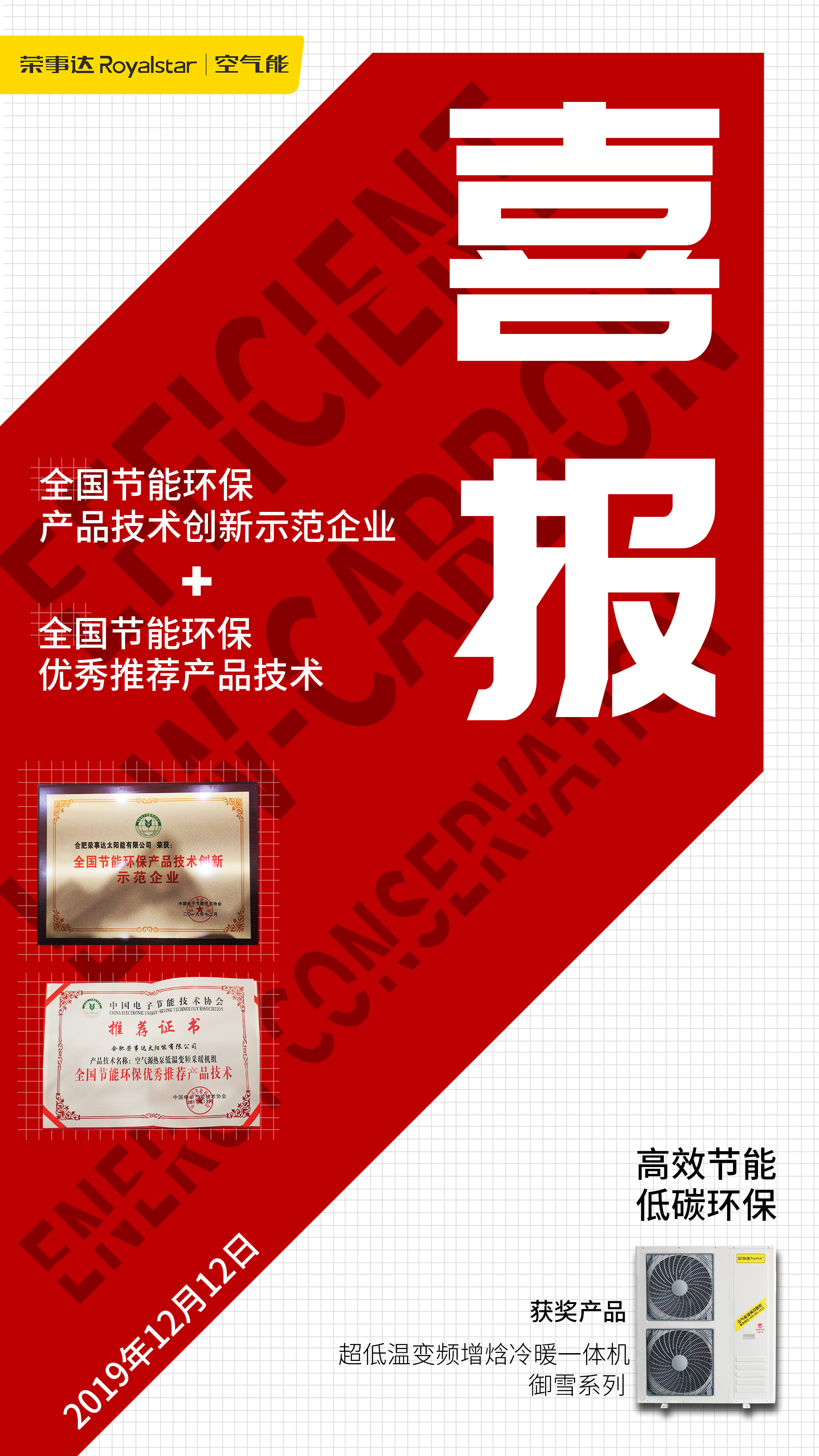 荣事达空气能凭借在创新科技和良好的用户体验荣获“全国节能环保产品技术创新示范企业”称号,同时荣事达空气能超低温变频增焓冷暖机组获评“全国节能环保优秀推荐产品技术”。