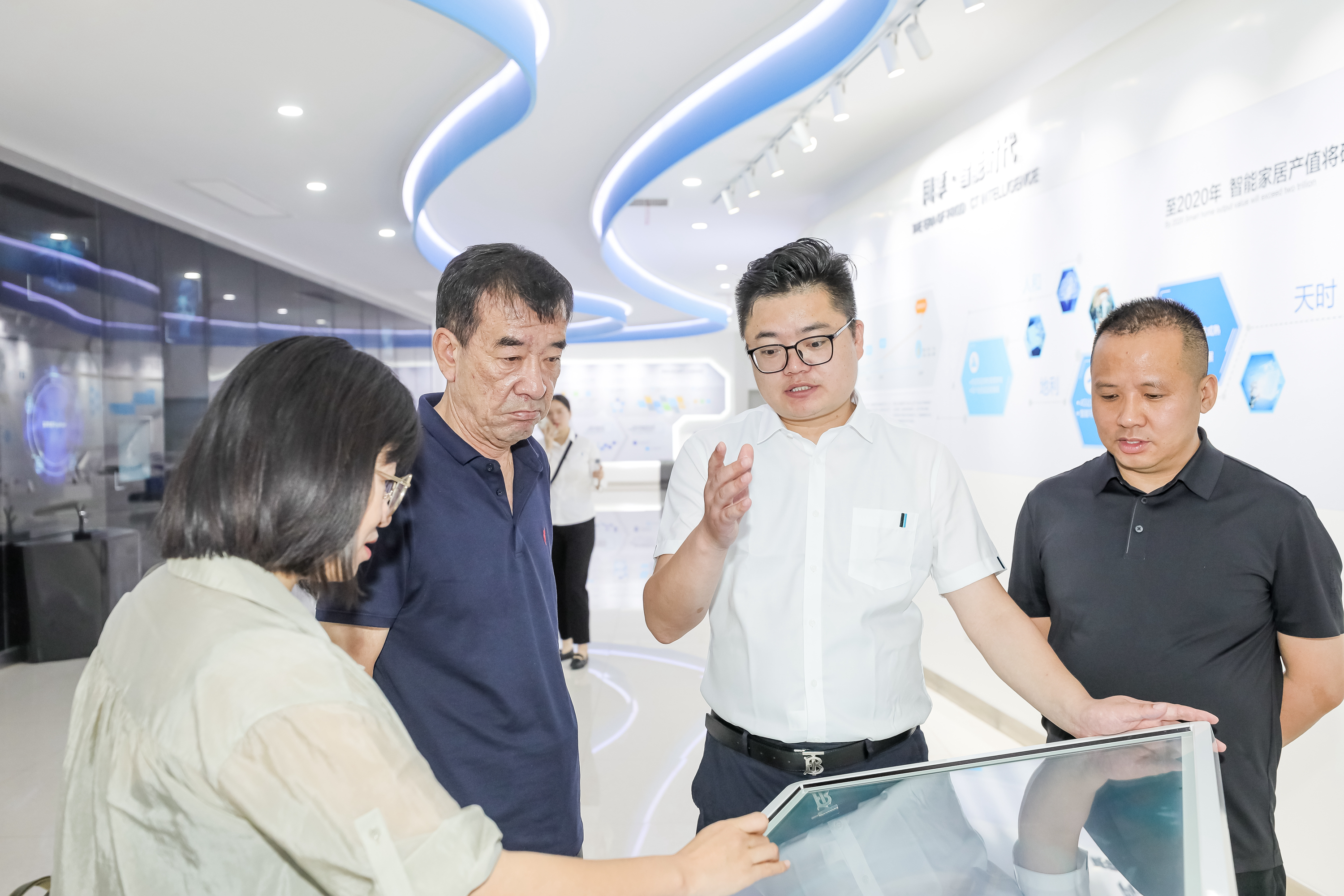 参观完荣事达空气能工厂,众人前往荣事达双创大学,参观智能家居检验检测实验室、品冠E家科技住宅展厅、智慧文旅舱项目展陈等,每一处都有相应专业人员带领讲解展示。荣事达所涉及产品的范围之广、品类之多,让领导们感叹不已,众人边听介绍边参观,时而拍照留念,现场氛围十分融洽。